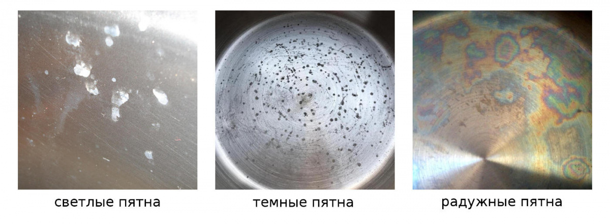 Радужные пятна также встречаются на изделиях из НЖС, однако они связаны не с водой, а с перегревом сплава. Дело в том, что НЖС покрыта оксидным слоем, имеющим тот самый сине-радужный оттенок, однако, он настолько тонок, что не виден нашему глазу. При перегреве данный слой утолщается до видимых размеров, убрать пятна можно с помощью наждачной бумаги. Однако, наждачка истончает защитный слой, поэтому от радужных пятен лучше не избавляться – находясь на внутренней части поверхности, они не влияют на внешний вид утвари.