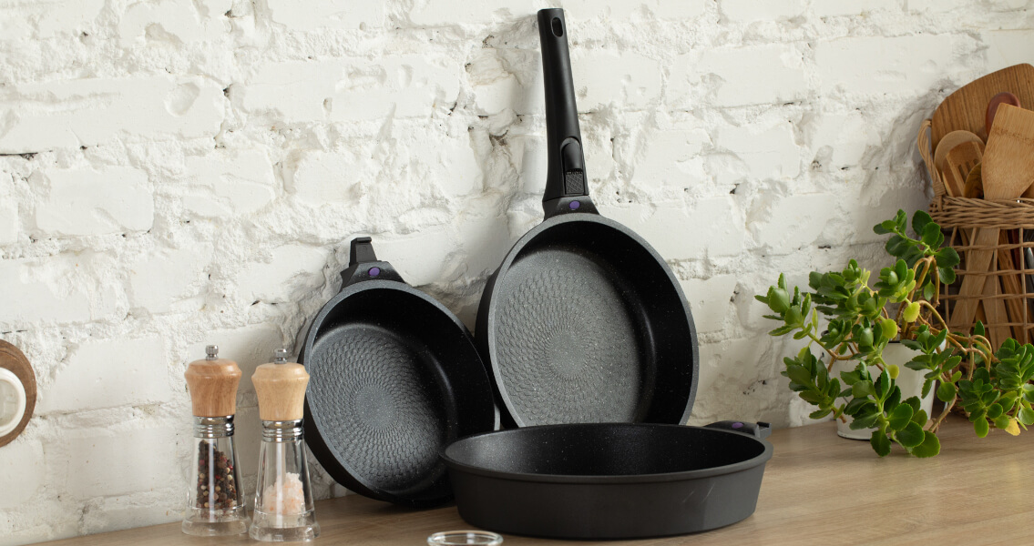 Сегодня на рынке популярны тефлоновые (PTFE), керамические, гранитные и мраморные сковороды. Все они устроены по одному принципу: гладкая поверхность + масляная плёнка создают эффект, при котором еда не прилипает.