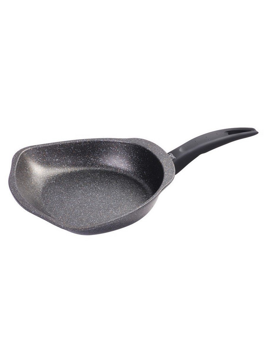 Это сковорода оригинальной формы с неровными краями черного цвета с серыми вкраплениями внутри и снаружи. Ручка выполнена из бакелита — термостойкий пластик с низкой теплопроводностью, благодаря чему она практически не нагревается. Покрытие Soft-touch обеспечивает удобный захват, ручка не скользит в руке.