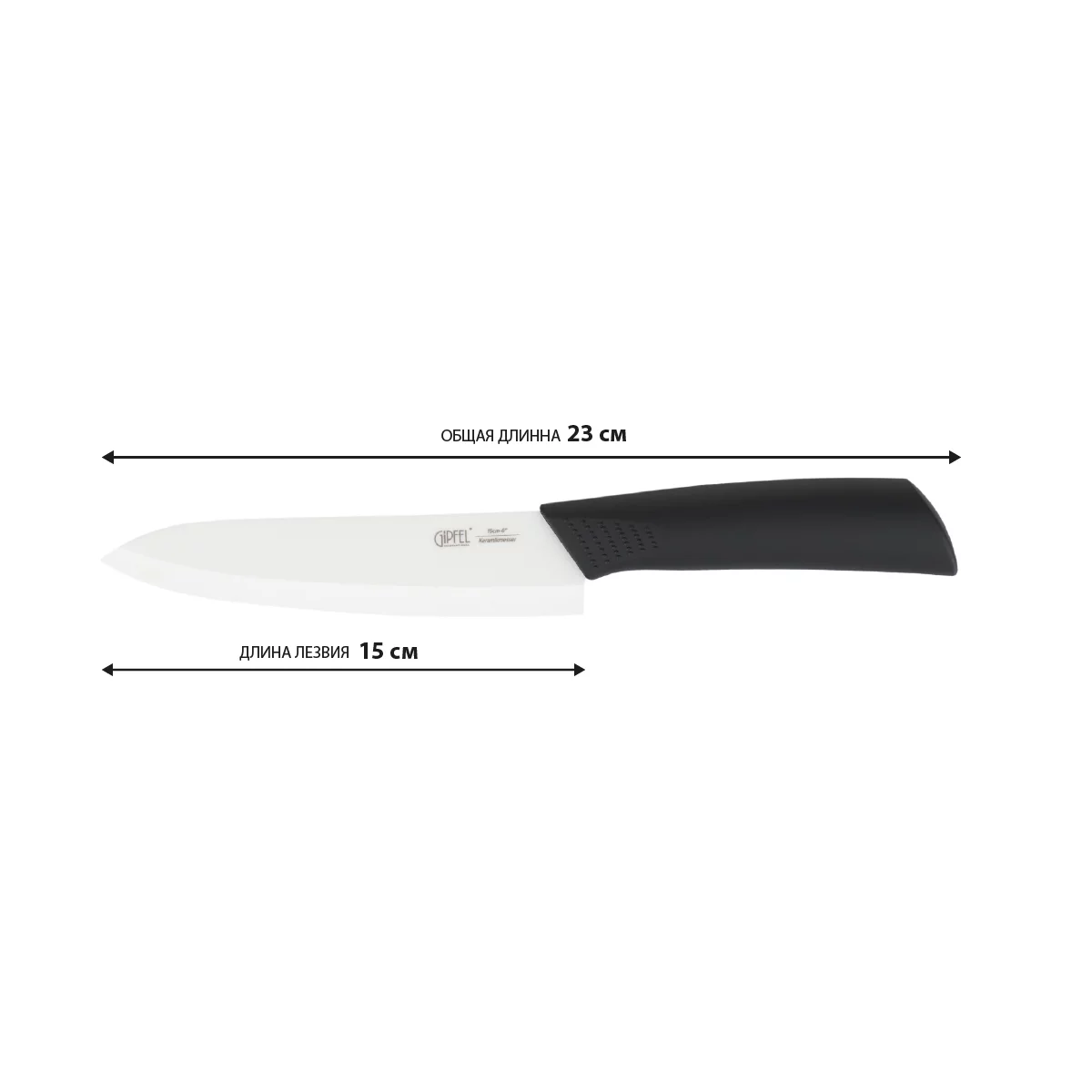 Универсальный нож Gipfel 8460. Керамическое лезвие длиной 15 см. Многофункциональный нож, который позволяет нарезать почти любой продукт: от зелени, овощей, фруктов до мякоти мяса или птицы. Керамическое лезвие отличается превосходным сочетанием экологичности, остроты, гибкости и прочности, то есть именно тем, чем и должен выделяться идеальный кухонный нож. Добавьте к этому удобную бакелитовую ручку, которая не выскальзывает при резке, и вы получите настоящий профессиональный нож. Острое лезвие легко очищается и не требует частой заточки.