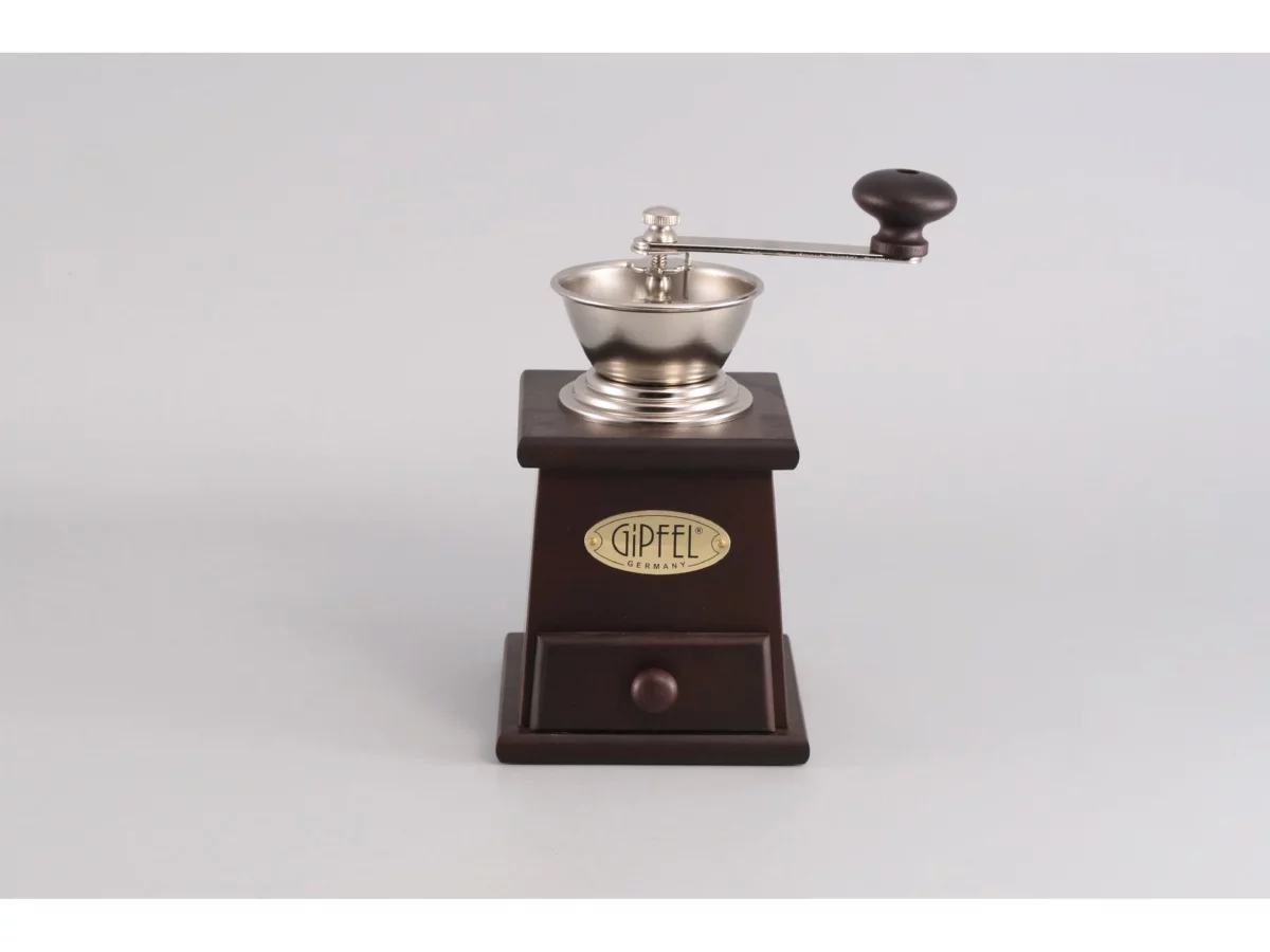 Кофемолка ручная GIPFEL HANNA 9238. Кофемолка выполнена в классическом стиле, имеет открытую воронку для зерен и оснащена выдвижным ящичком для молотого кофе. Сделана из темного каучукового дерева с элементами из углеродистой стали и железа. Размер 11,5х11,5х20см. В кофемолке предусмотрена возможность регулировать степень помола. Кофемолка упакована в фирменную коробку Gipfel.