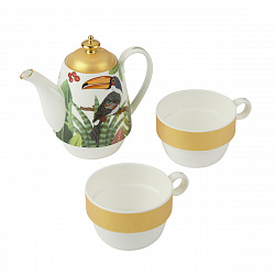 Чайный сервиз Gipfel TROPICO ORO 3950 из 3 предметов на две персоны: чайник 420мл, 2 чашки 150мл. Яркий необычный заварочный чайник с изображением тукана в зеленых зарослях подарит атмосферу цветущего тропического утра даже самому обычному чаепитию. Чашки и чайник удобно хранить, составив пирамидкой.